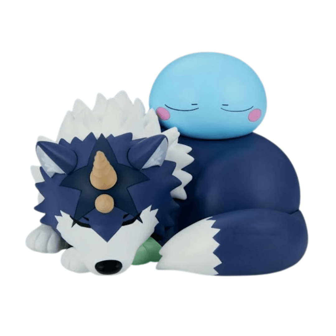 La figura presenta a Rimuru acompañado de Ranga, el majestuoso lobo tempest, recreados con proporciones suaves y un acabado tipo soft vinyl que resalta los detalles del esculpido y la pintura. El resultado es una pieza con gran presencia visual, perfecta para exhibir en cualquier colección de anime.