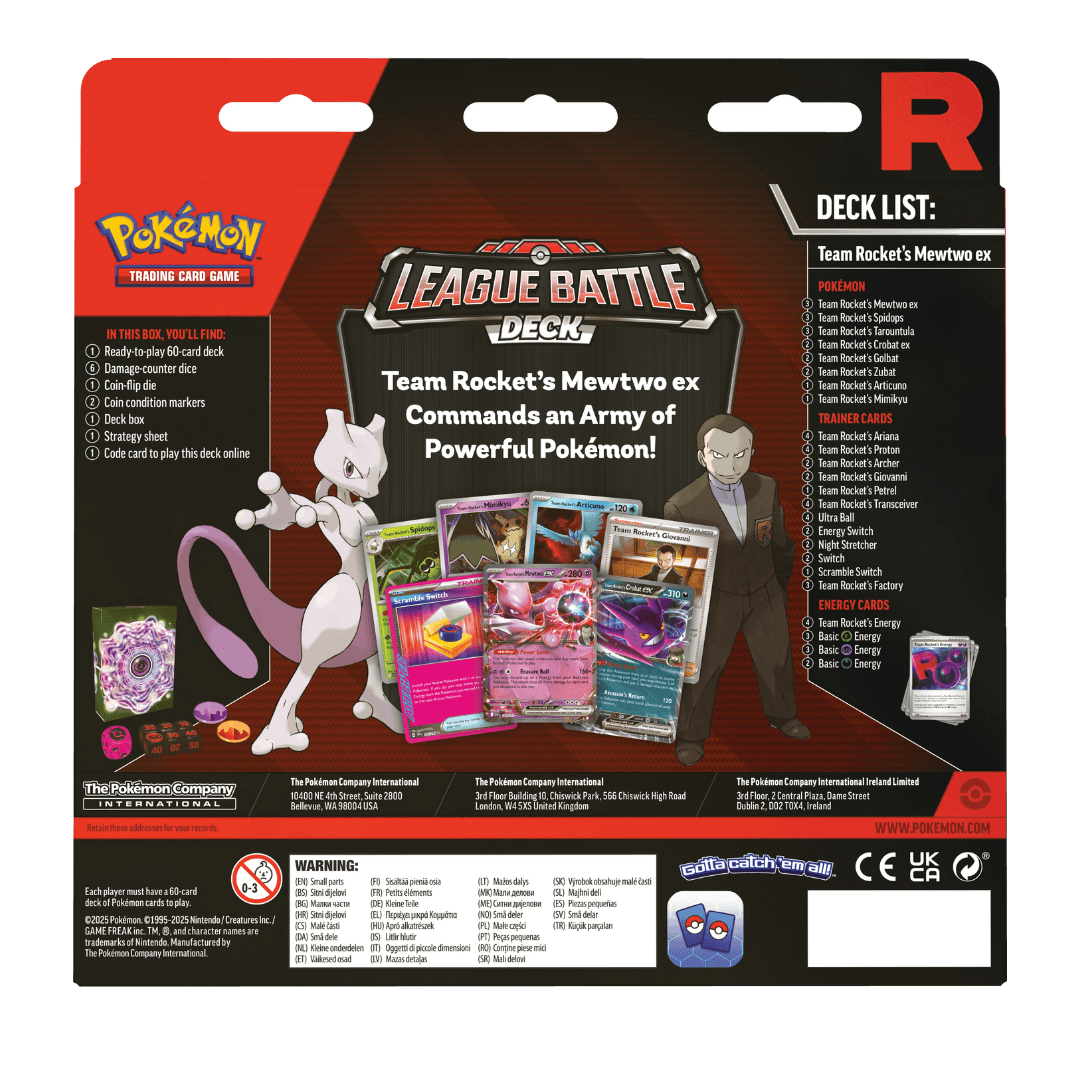 Domina el juego con el Pokémon TCG: League Battle Deck – Team Rocket’s Mewtwo ex, un mazo competitivo de 60 cartas listo para jugar con carta promo exclusiva. ¡Perfecto para torneos y coleccionistas!
