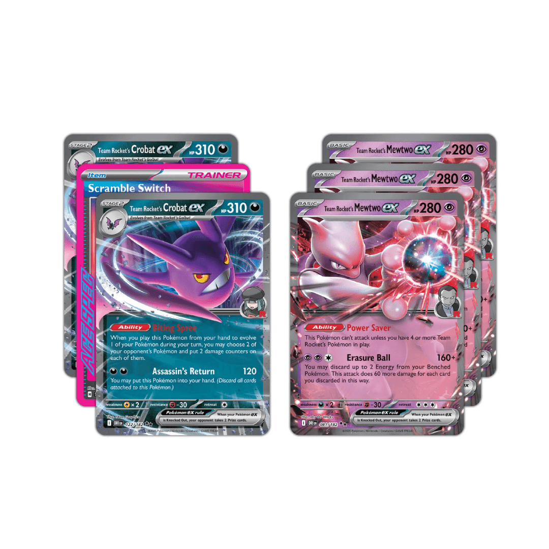 Mewtwo ex regresa con un diseño inspirado en la estética del Team Rocket, añadiendo un toque oscuro, intimidante y perfecto para jugadores que aman los estilos de juego ofensivos. Este deck viene completamente armado con 60 cartas listas para jugar, incluyendo cartas clave, energías especiales, entrenadores competitivos y una carta promocional exclusiva de Mewtwo ex que se convierte en el centro de tu estrategia.