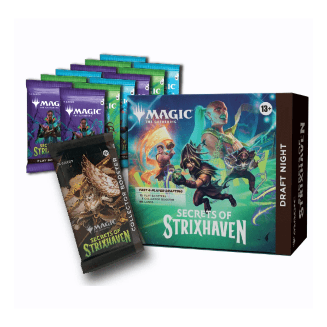 El Draft Night incluye todo lo necesario para que varios jugadores participen en una sesión de Draft sin complicaciones. Cada participante recibe sobres de la expansión Secrets of Strixhaven, donde podrá seleccionar cartas estratégicamente, construir su propio mazo y enfrentarse en partidas llenas de decisiones inteligentes. Es perfecto tanto para jugadores nuevos que desean aprender como para veteranos que buscan perfeccionar su estilo de juego.